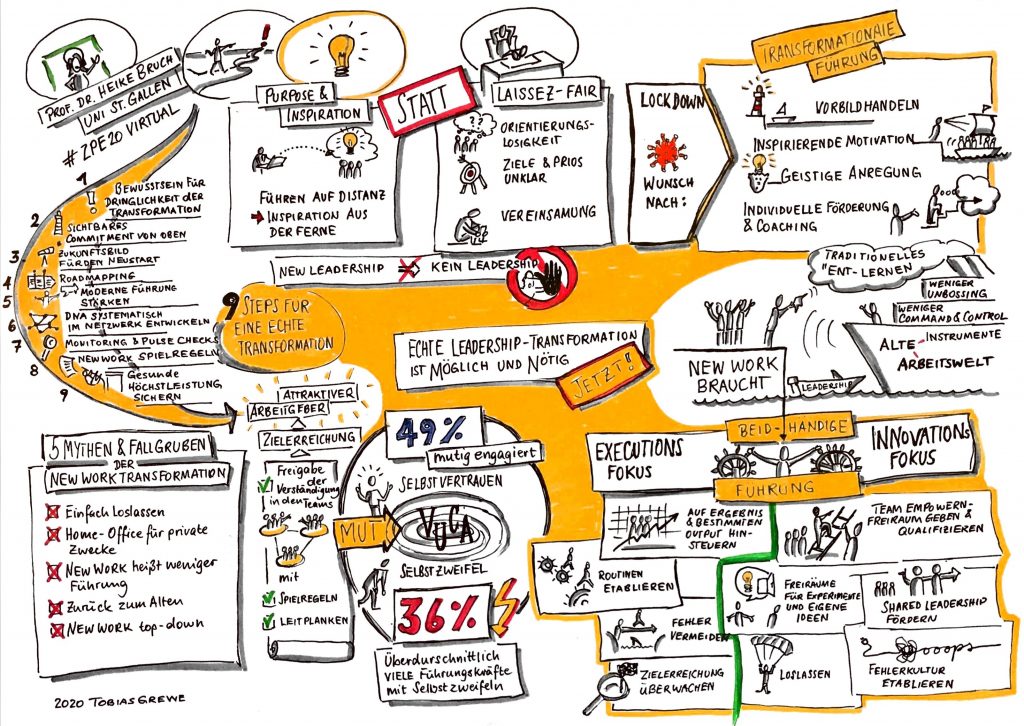 In ihrem Impuls am 16. Oktober 2020 auf der Zukunft Personal 2020 zeigte uns Prof. Dr. Heike Bruch, was „New Leadership“ wirklich bedeutet. Gerade in Zeiten von Corona wird uns durch die Digtialisierung vor Augen geführt, Führen auf Distanz ist „Inspiration aus der Ferne“ statt „Laissez-Fair“. Letzteres führt durch die Homeoffice-Orientierung vermehrt zur Vereinsamung. Im Lockdown gab es mehr und mehr den Wunsch nach Vorbildhandeln, inspirierende Motivation, geistige Anregung sowie individuelle Förderung und Coaching. Diese Wünsche sind auch die Kriterien, virtueller Führung jetzt und in Zukunft. Den NEW WORK braucht, dass wir in Sachen Führung Traditionelles „ent-lernen, uns von Comman & Control verabschieden und weniger Unbossing. Leadership wird mehr und mehr kontextbezogen. Daher ist eine beidhändige Führung notwendig, um in VUCA Zeiten zu bestehen. Frau Prof. Dr. Bruch spricht bei Ambidextrie von „Führung mit Exekutions-Fokus“ und mit „Innovations-Fokus“.